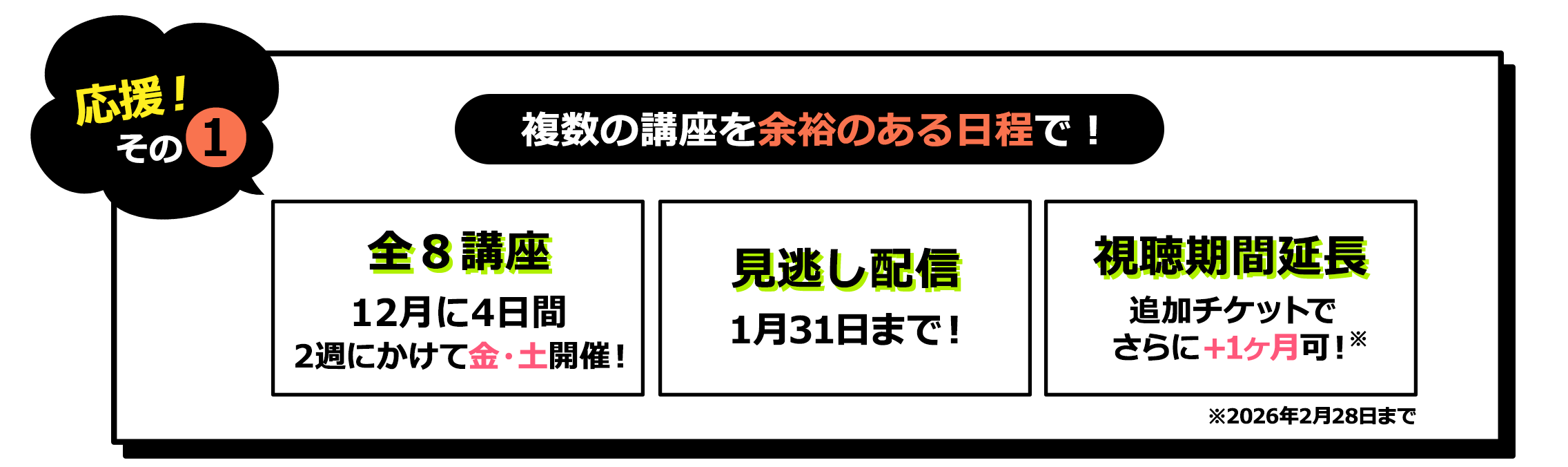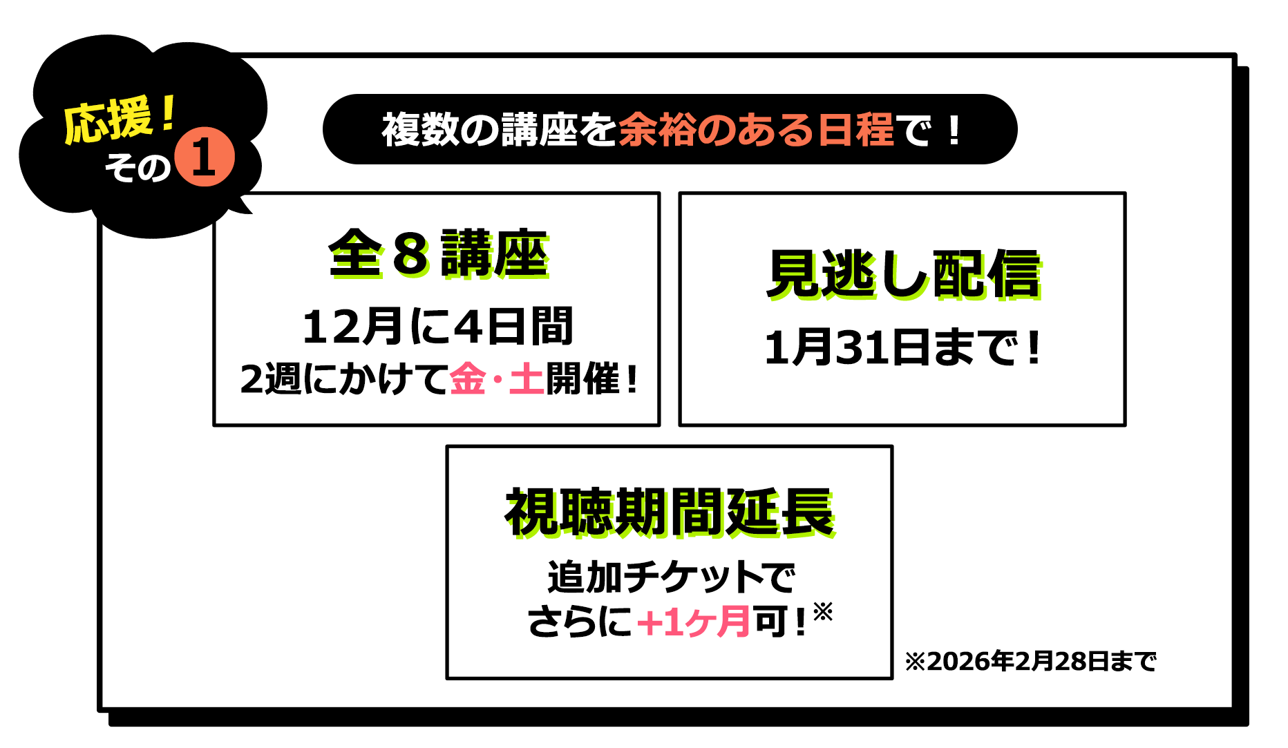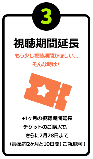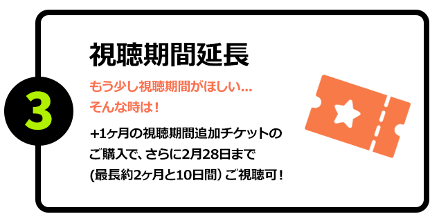見逃し配信期間に加え、さらにご視聴期間を2026年2月28日(土) 23:59 まで延長できるチケットです。
