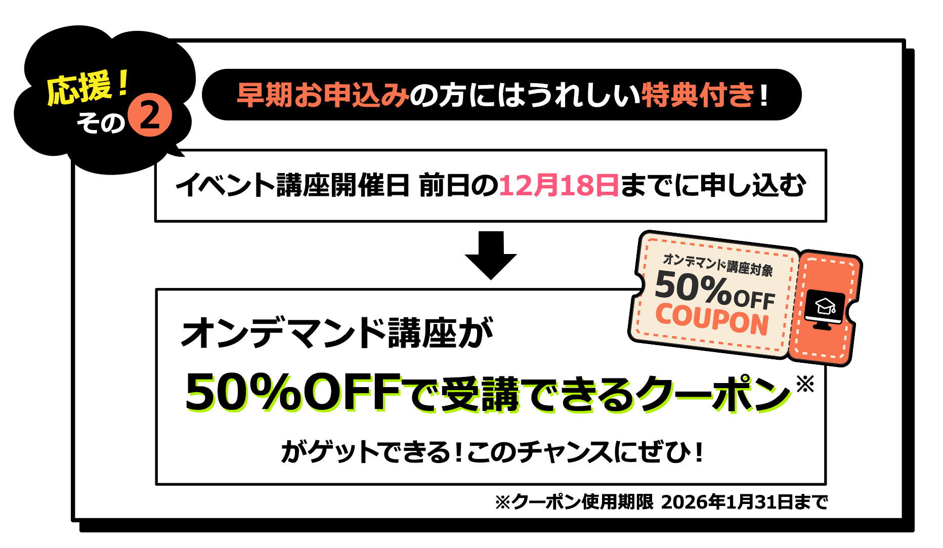 本イベントは、2025年12月19日の開催初日以降も随時お申し込みを受け付けておりますが、開催日前までにお申し込みを済ませますと、特典クーポンの獲得や視聴期間も余裕をもって視聴でき、事前の準備が整ったうえで本イベントに臨めます。