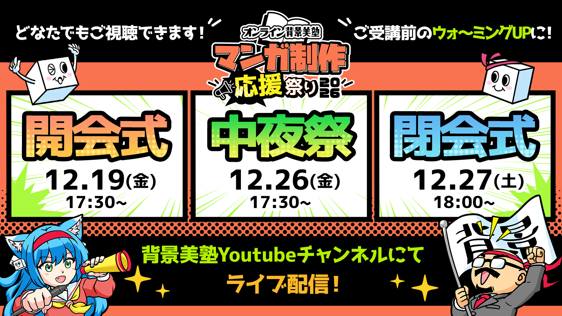 19日(金)の開会式・26日(金)の中夜祭・27日(土)の閉会式は、Youtubeチャンネルにて配信!