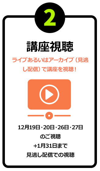 見逃し配信1ヶ月付きなので、当日のライブ配信後でもアーカイブにてご自身のペースでご受講が可能です。