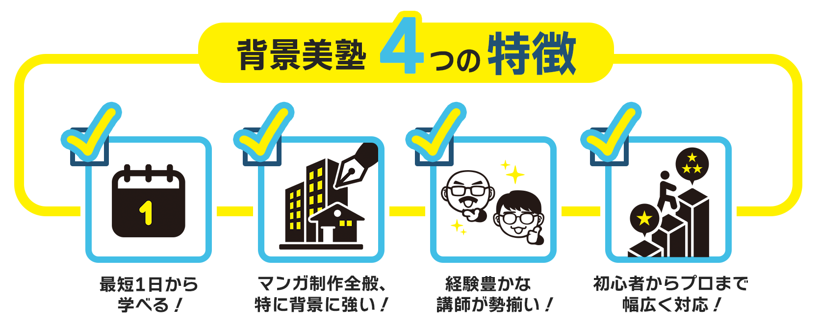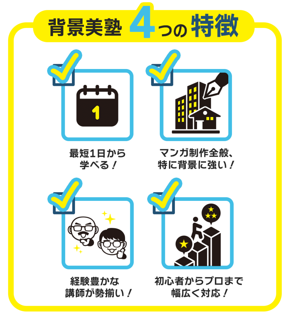 ネット上には数多くのマンガの作り方やキャラの描き方がありますが、作画をする上で 一番大切なのは「ひらめき」と、その使い方を知ることでの「手応え」です。この手応えを感じ取るというのは、一人ではなかなか難しいものです。ですが、努力の方法を知ると手応えをモノにしやすくなり、得られる技術も増えます。背景美塾の講座では、実戦型の授業と現場で使えるプロの技術により、 確実な作画力向上を目指しています。
